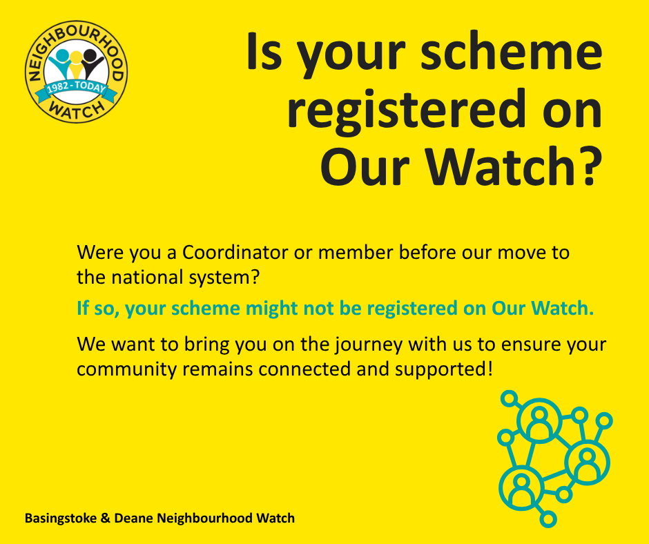 At the Basingstoke & Deane Neighbourhood Watch Association (BDNWA), we are modernising how we stay in touch to ensure no scheme is left behind. As part of our commitment to becoming a more transparent and supportive Association, we are asking all local schemes to make sure they are registered on the national Our Watch system.